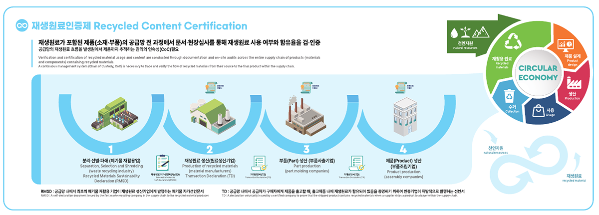 재생원료*가 포함된 제품(소재·부품)의 공급망 전과정에서 재생원료 사용여부와 함유율을 인증하는 제도